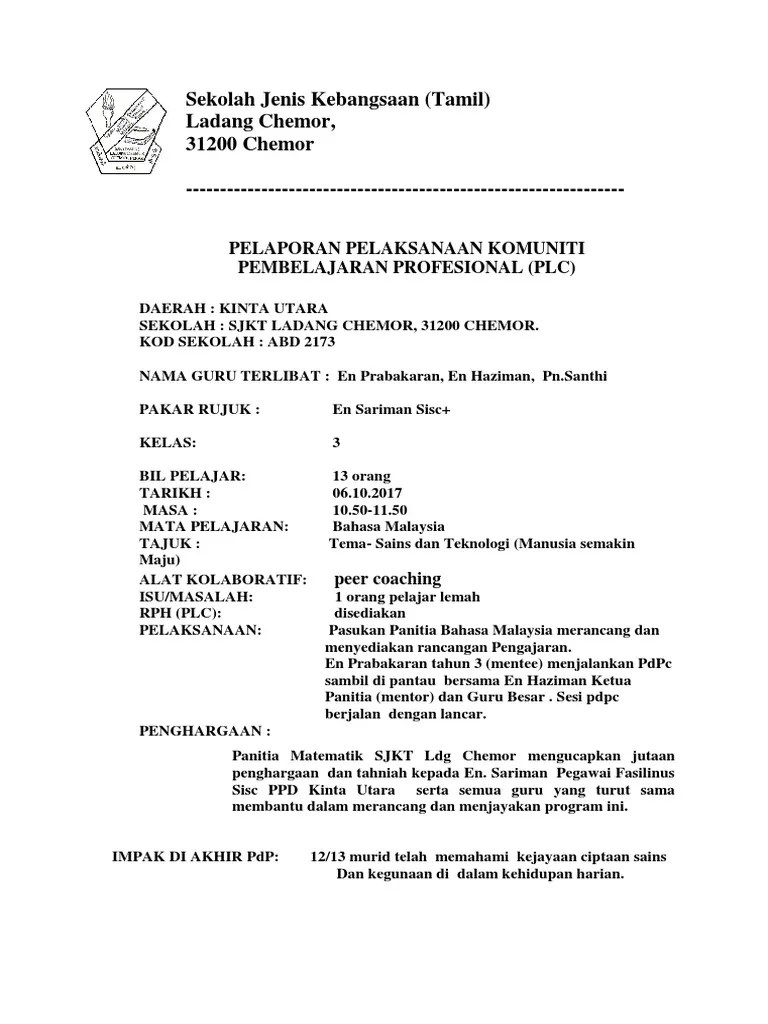 Laporan aktiviti panitia. Panitia Bahasa Melayu Panitia Bahasa Inggeris dsbg. Laporan tahunan panitia bahasa melayuCONTOH SMK RAJA PEREMPUANIPOH PERANCANGAN PANITIA BAHASA MELAYU TAHUN 2011 PelaksanaTanggung Tempoh Kos TOV ETR Penilaian Indikator Bil ProgramAktiviti Objektif jawab Sumber Pencapaian A Program Utama 1 Rancangan Melaksanakan T1- PnS Fadzilah Januari PCG Panitia 100 guru yang 100 guru yang Rancangan.